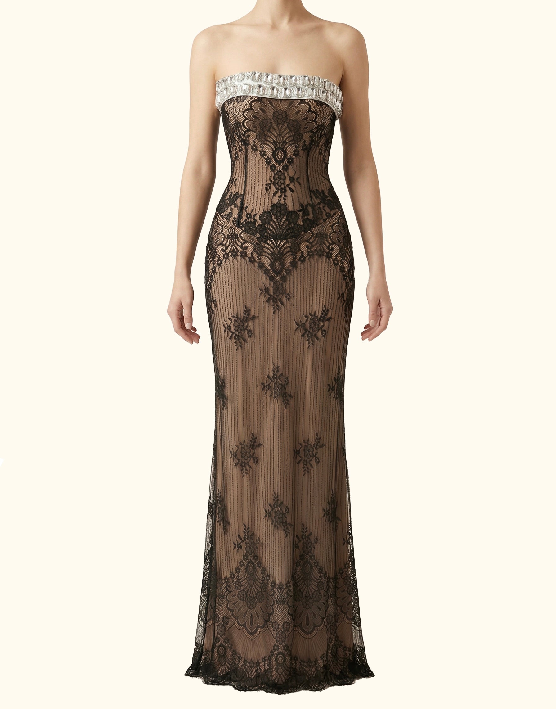 An elegant strapless evening gown crafted from delicate black lace over a nude base, creating a striking and sophisticated contrast. The fitted silhouette enhances the figure, while the intricate lace patterns add depth and timeless charm. Finished with a refined neckline detail