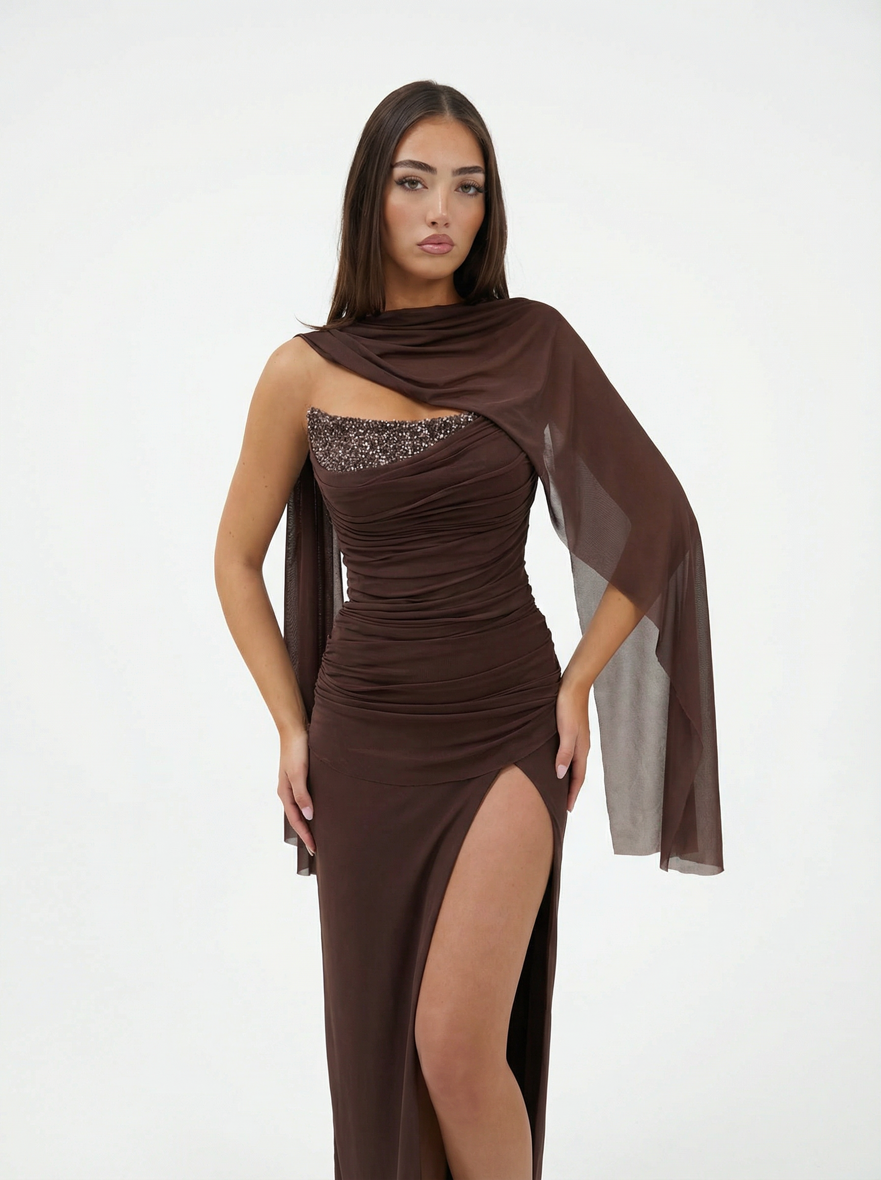 This sophisticated brown evening gown features an elegant draped design that beautifully contours the body. The fitted silhouette is enhanced by delicate ruching and a subtle shimmering detail at the neckline, adding a touch of luxury.