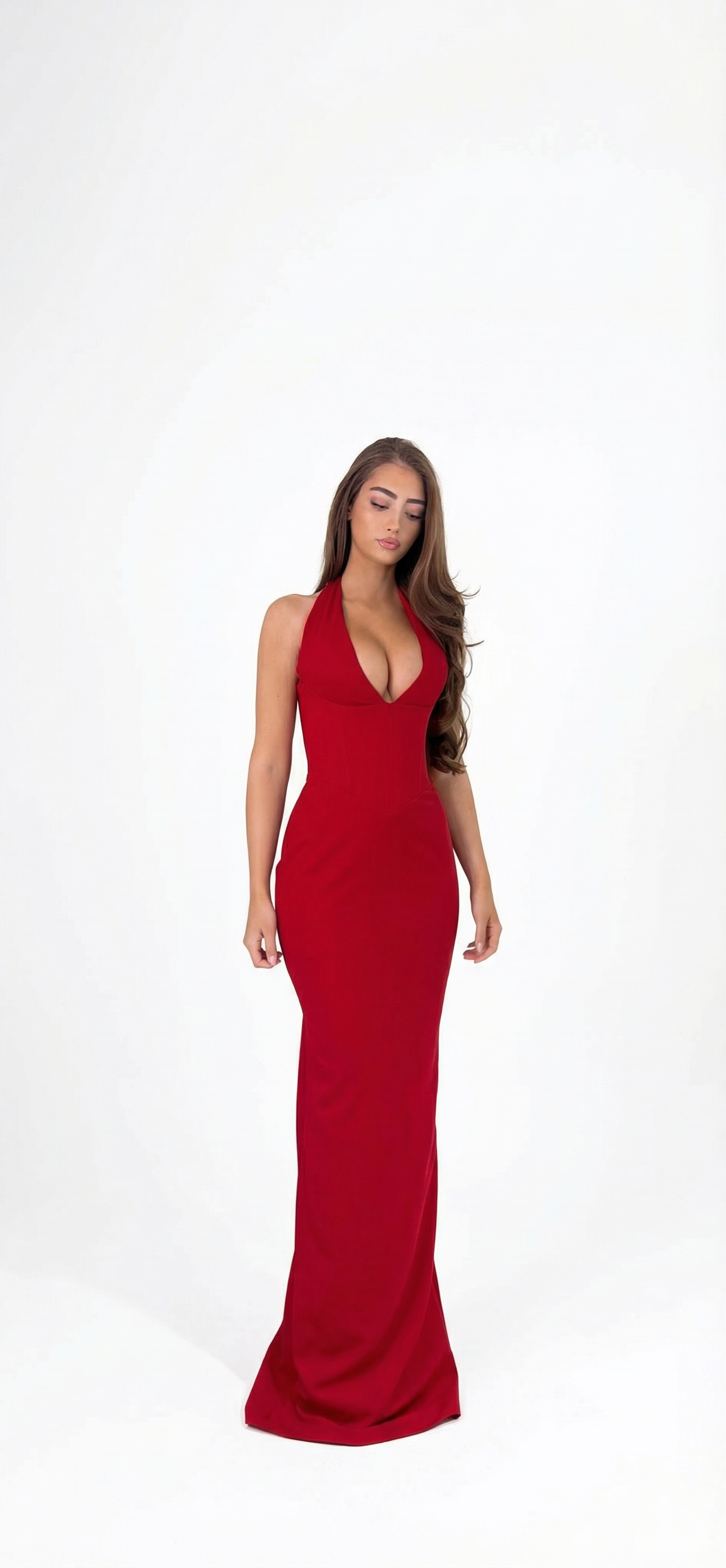 A breathtaking navy evening gown designed to highlight the feminine silhouette with elegance and confidence. The halter neckline with a deep plunge creates a bold yet sophisticated look, while the fitted bodice and smooth floor-length skirt sculpt the body beautifully.